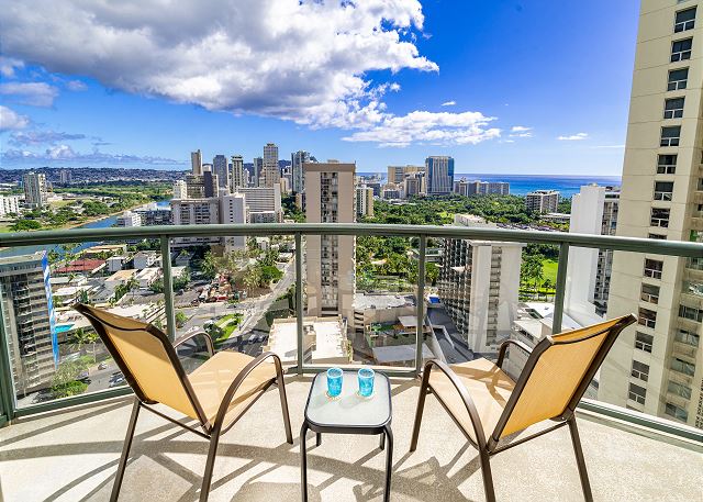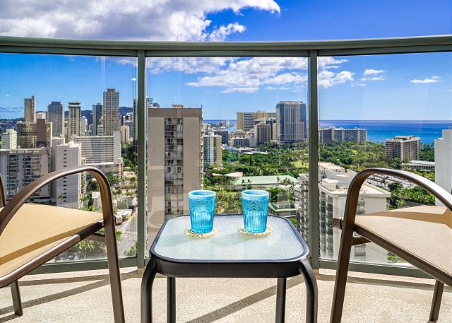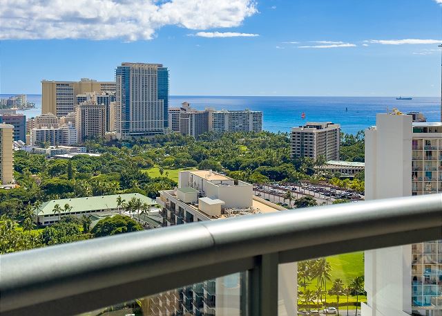 ・ワイキキの街風景を見渡す、オーシャンビューの広い専用バルコニーへのアクセス