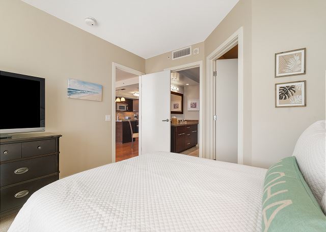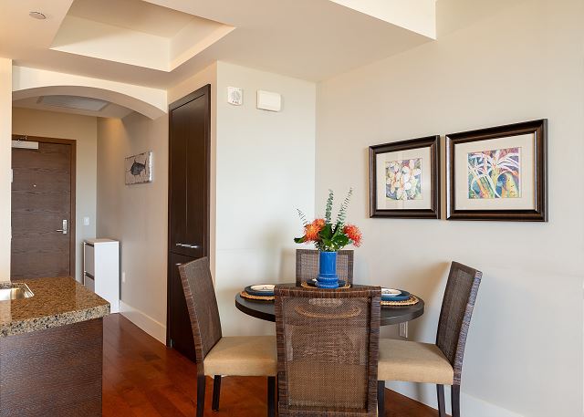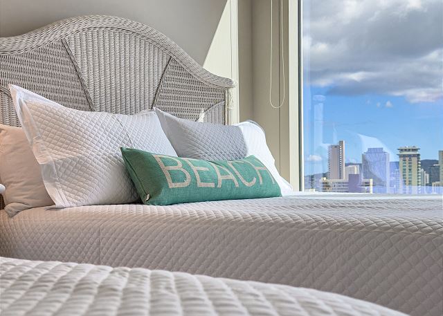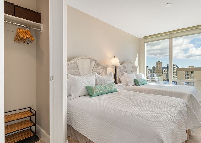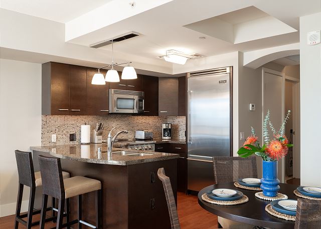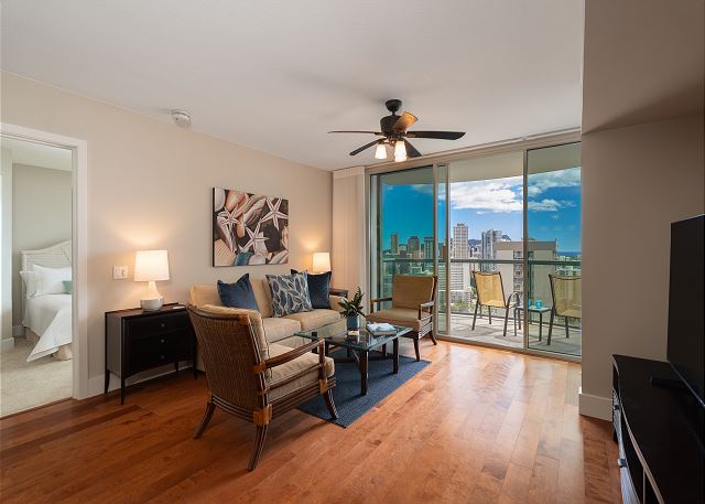 ワイキキの端にある、静かな高級コンドミニアム「アルーア・ワイキキ」27階のラグジュアリーな2ベッドルーム・2バスのバケーションレンタル。上質な家電と食洗機付きのフルキッチンで到着後いつでもお料理を楽しめます。お部屋はセントラルエアコンで夏でも快適にお過ごしいただけ、無料ハイスピードWi-Fi、室内に便利な洗濯機・乾燥機を完備、無料館内駐車場付き。ラナイではオーシャンビューを眺めながら、海からの風を感じてゆったりとした時間をお楽しみいただけます。レストラン、ビーチ、アラモアナショッピングセンター、インターナショナルマーケットプレイス全て徒歩圏内!バス停も近くにあり、好立地でどこへ行くにも大変便利です。