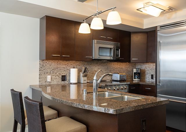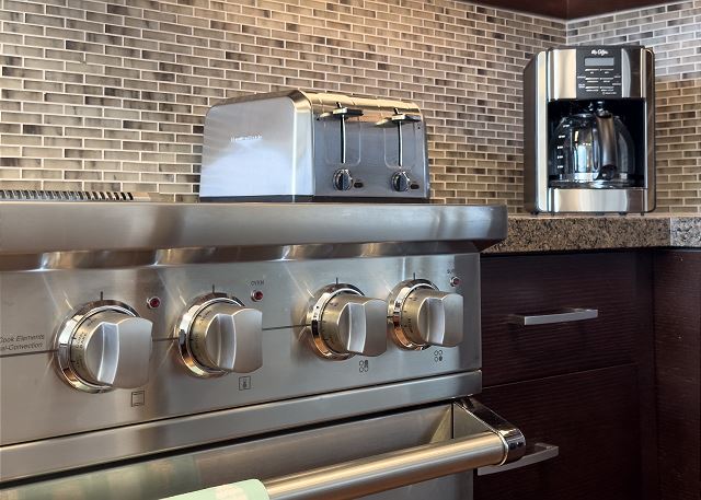 ・フルに完備されたグルメキッチン(4口電気コンロ&オーブン、電子レンジ、トースター、コーヒーメーカー、炊飯器、食洗機付き)
