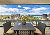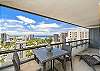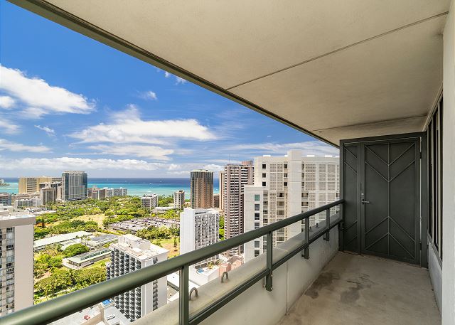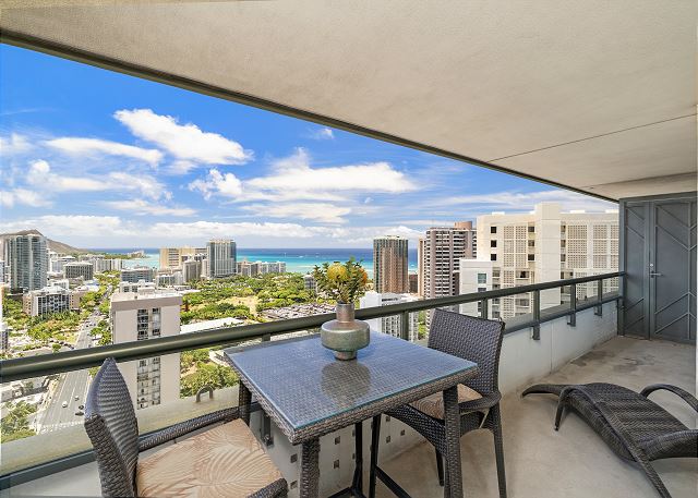 ・ワイキキの街風景とオーシャンビューを見渡す、広い専用バルコニーへのアクセス(テーブルと椅子2脚、ラウンジチェアをご用意)
