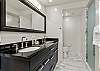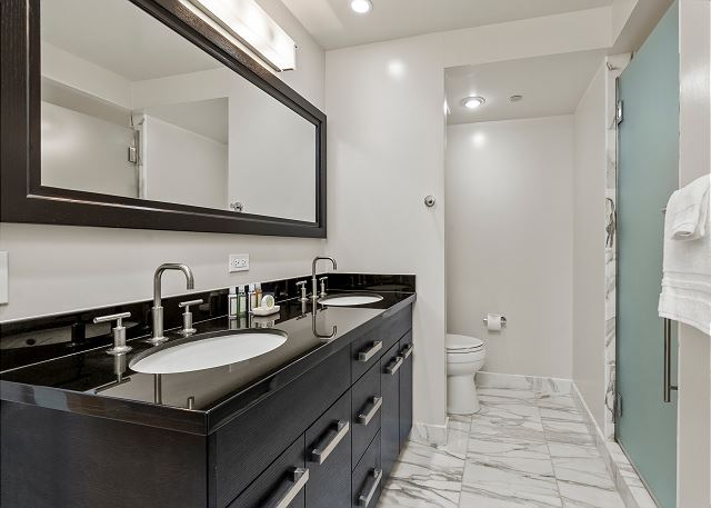 ・バスルームは石のフローリングに便利なダブルの洗面台