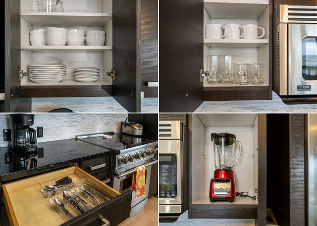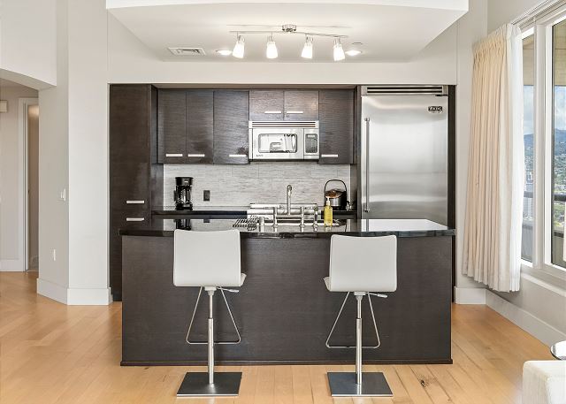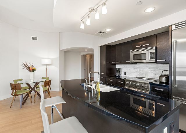 ・高級家電を完備したフルキッチン(製氷機付き冷蔵庫、4口電気コンロ&オーブン、電子レンジ、トースター、コーヒーメーカー、ブレンダー、炊飯器、食洗機付き)