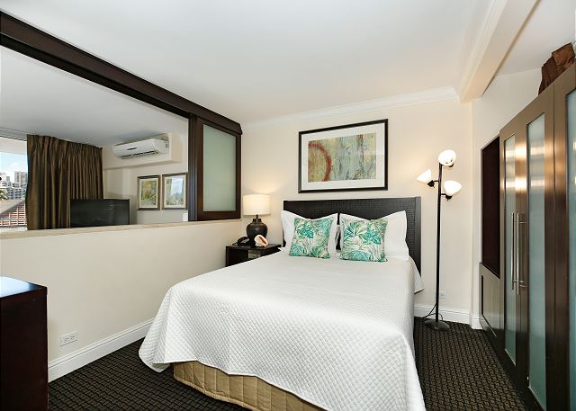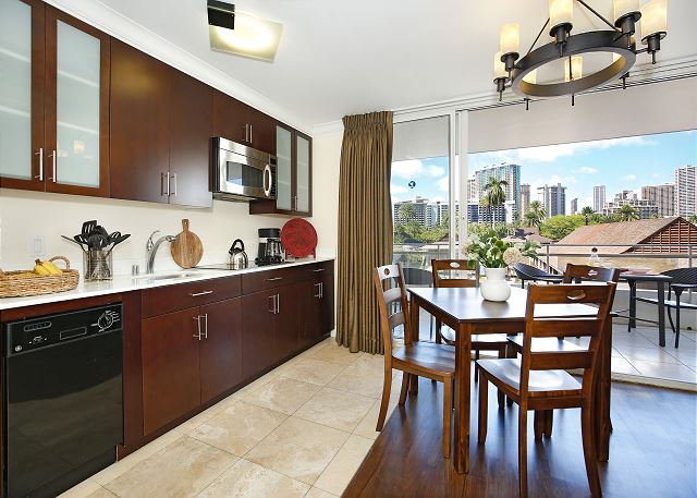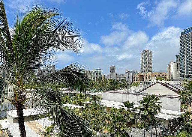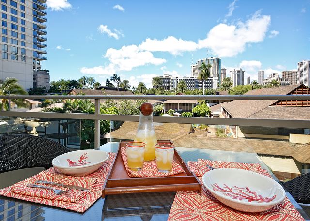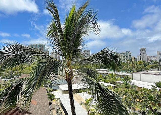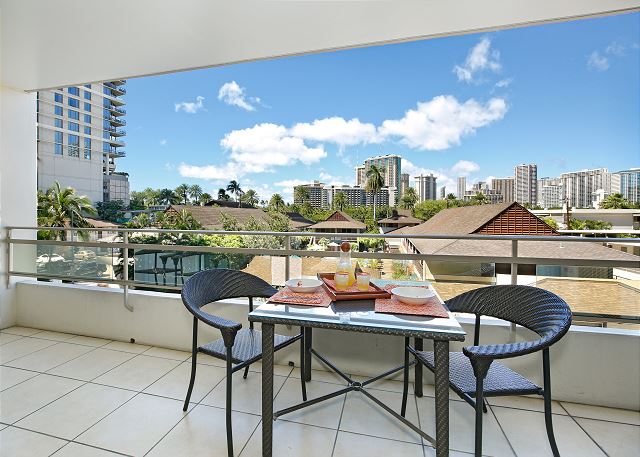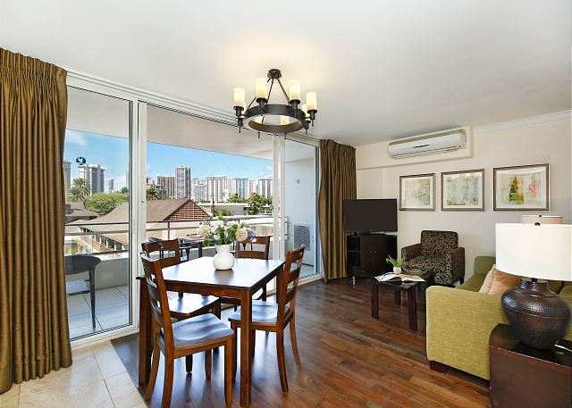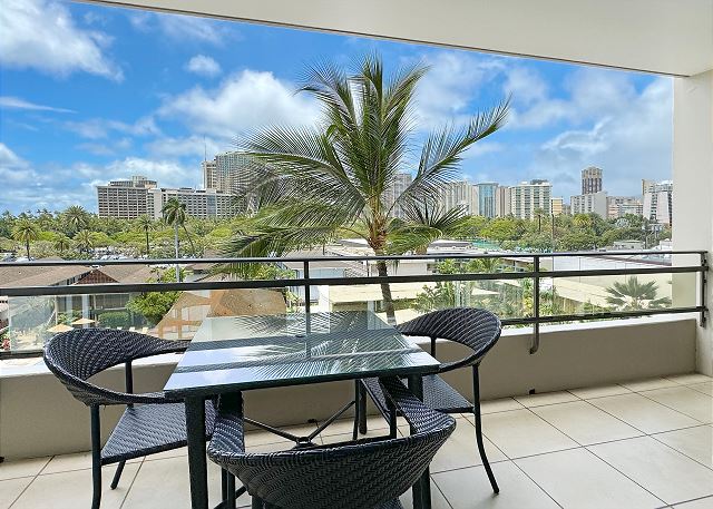 お部屋には静かなエアコン、無料室内Wi-Fi、フルキッチンも完備。徒歩5分ほどにある屋外駐車場のパスが1台分無料で含まれます。テーブルと椅子が用意された広いバルコニーでは、ハワイの風を感じながら朝食を食べたり、夜のリラックスした時間をお過ごしいただけます。