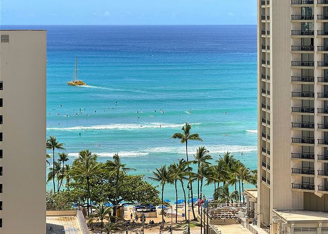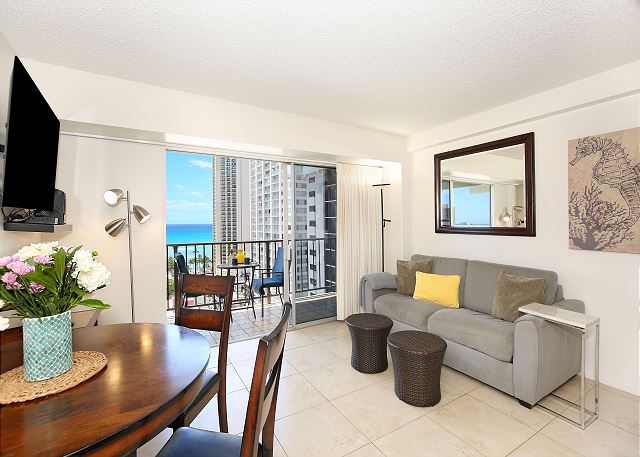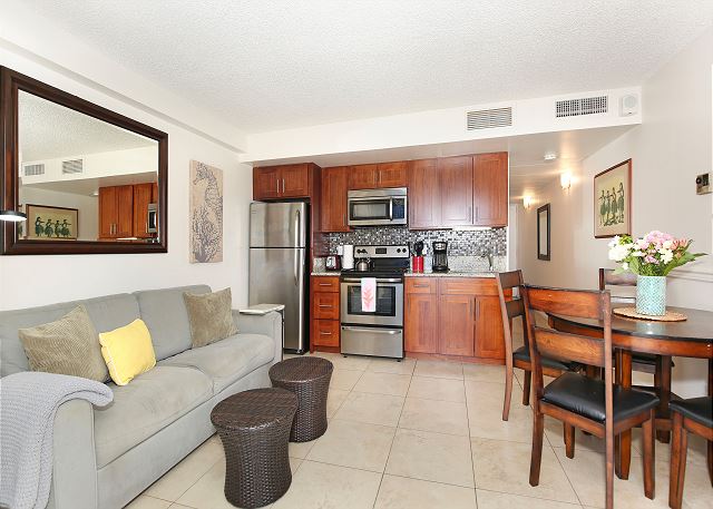 ビーチまで徒歩わずか5分の素晴らしい立地条件を持つこの1ベッドルームのコンドミニアムからはパーシャルオーシャンビューが見渡せます。シンプルでモダンなデザインのインテリアが揃えられ、ゆっくりワイキキでの滞在をお楽しみいただけます。キッチンはフルに揃えられ、ご到着後、すぐにお料理をお楽しみいただけます。ショッピング、レストラン、ビーチが全て徒歩圏内にあり、ご家族旅行におすすめのお部屋です。建物1階には1度は行ってみたいあの有名なHy's Steak Houseがあります。