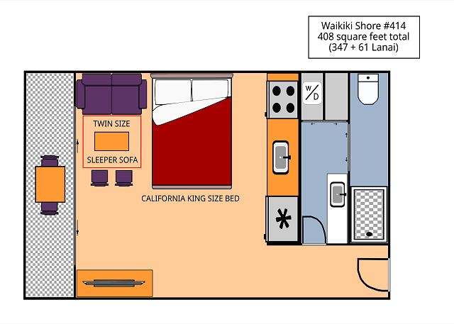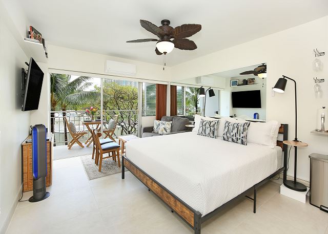 ワイキキで唯一のオン・ザ・ビーチ・コンドミニアム、ワイキキショアの4階にあるこちらのワンルームスタジオは2024年に改装されたばかりのお部屋。コンパクトながらも設備の整ったフルキッチン、嬉しい室内洗濯機・乾燥機、ウォシュレット付きで、プライベート、ワーケーションにも便利な無料室内Wi-Fi、静かなスプリット型エアコンがあり、素敵なハワイステイを快適にお過ごし頂けるバケーションレンタルです。