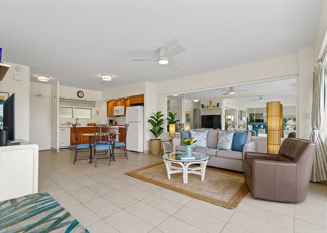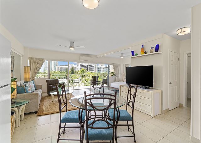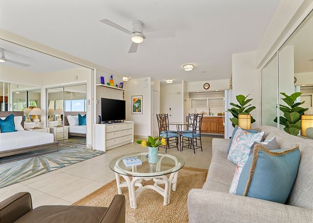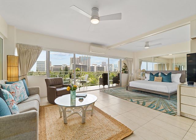 ワイキキで唯一のオン・ザ・ビーチコンドミニアム、ワイキキショアの6階にあるオーシャンビューの1ベッド/1バスルーム。ラナイへのドアはお部屋の端から端まであるガラスドアになっており、美しいオーシャンビューが広がっています。朝起きたら静かな海を眺めながらラナイでの朝食を、また、ワイキキビーチでの1日を楽しんだ後は、広いプライベートラナイでお好きなドリンクを片手にサンセットを眺めながらリラックスした時間をお過ごしください。オープンコンセプトの落ち着いた雰囲気のインテリアで、室内にはフルキッチン、エアコン、ウォークインクローゼット、室内洗濯機・乾燥機、ウォシュレット、無料室内Wi-Fiも完備しており、快適なハワイステイをお楽しみいただけます。