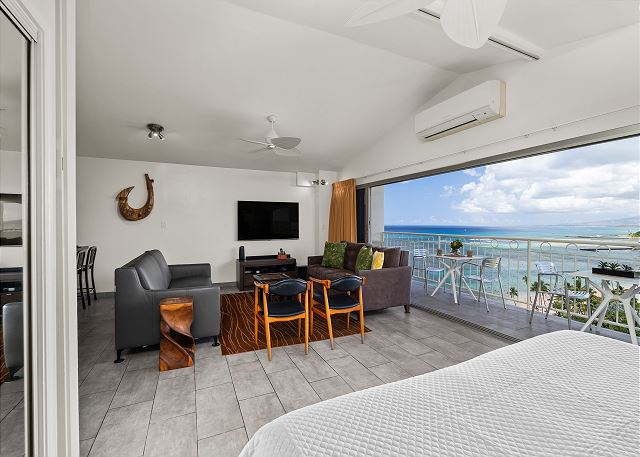 ワイキキで唯一のオン・ザ・ビーチコンドミニアム、ワイキキショアの15階にある1ベッド/2バスルームのペントハウス。全てのお部屋から美しく広がるオーシャンビューをお楽しみいただけます。広いプライベートラナイではお好きなドリンクを片手に1日中美しいオーシャンビュー、また夕方にはサンセットを眺めながらリラックスした時間をお過ごしいただけ、金曜日の夜にはヒルトンの花火もお部屋からご覧いただけます。室内にはフルキッチン、エアコン、洗濯機・乾燥機、ウォシュレット、無料室内Wi-Fiも完備しており、快適なハワイステイをお楽しみいただけます。