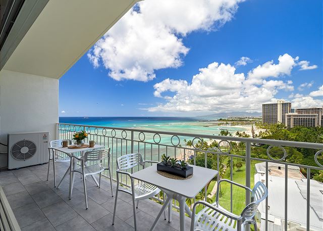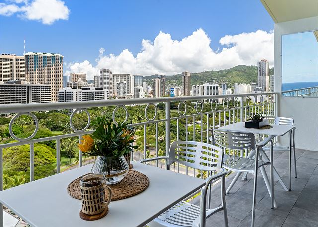 ・美しいオーシャン、ビーチ、シティビューが広がるプライベートラナイへのアクセス(4名分のテーブルと椅子をご用意)